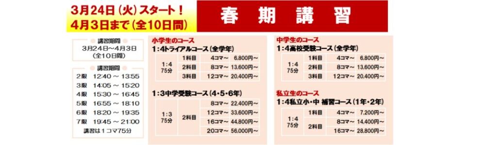 2026年 春期講習は以下の日程で実施いたします。 3月24日(火)~4月3日(金)の10日間 2限 12:40~13:55 3限 14:05~15:20 4限 15:30~16:45 5限 16:55~18:10 6 […]
