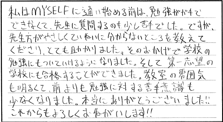 MYSELFは先生みんなやさしくて、いままでの塾より、はるかに勉強のやる気があがった。ここにくることで今までのストレスがなくなるし、かくじつに人生がかわった。ここで勉強したことで勉強じゃなくてもなんでも、何かに対しても見る目がかわったし、継続してできるという勇気をもらったし、これからの自分に強い気持ちをもてました。